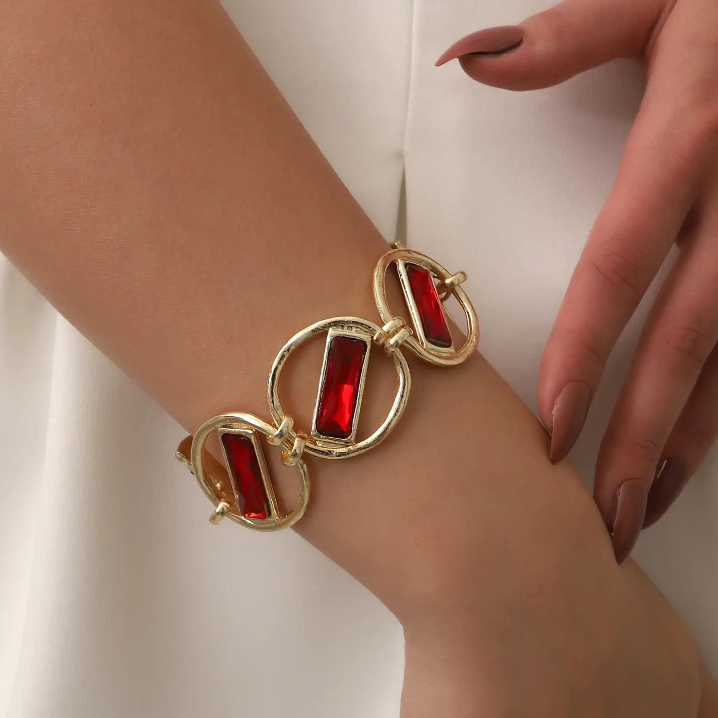 The Crimson Radiance Bracelet embodies bold elegance and timeless allure. Featuring vivid red rectangular stones set within sculpted golden links, this bracelet strikes a perfect balance between sophistication and statement style.