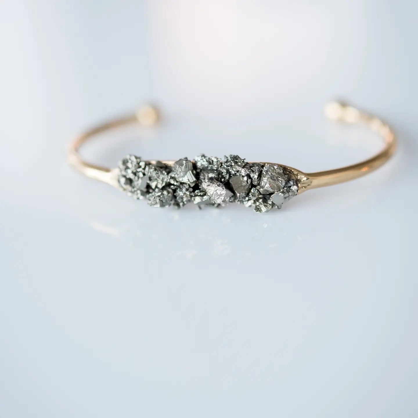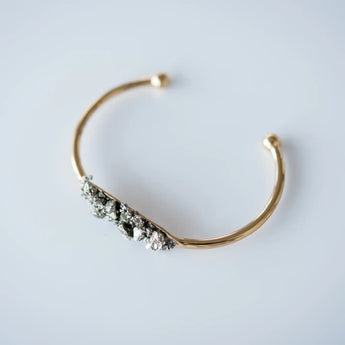 Pyrite, with its silver–gold brilliance, brings a touch of earthy character and contemporary edge to this sleek bracelet. Each piece is handcrafted, meaning every pyrite formation is naturally unique. The open cuff design offers flexibility and a comfortable fit for most wrist sizes.
