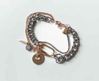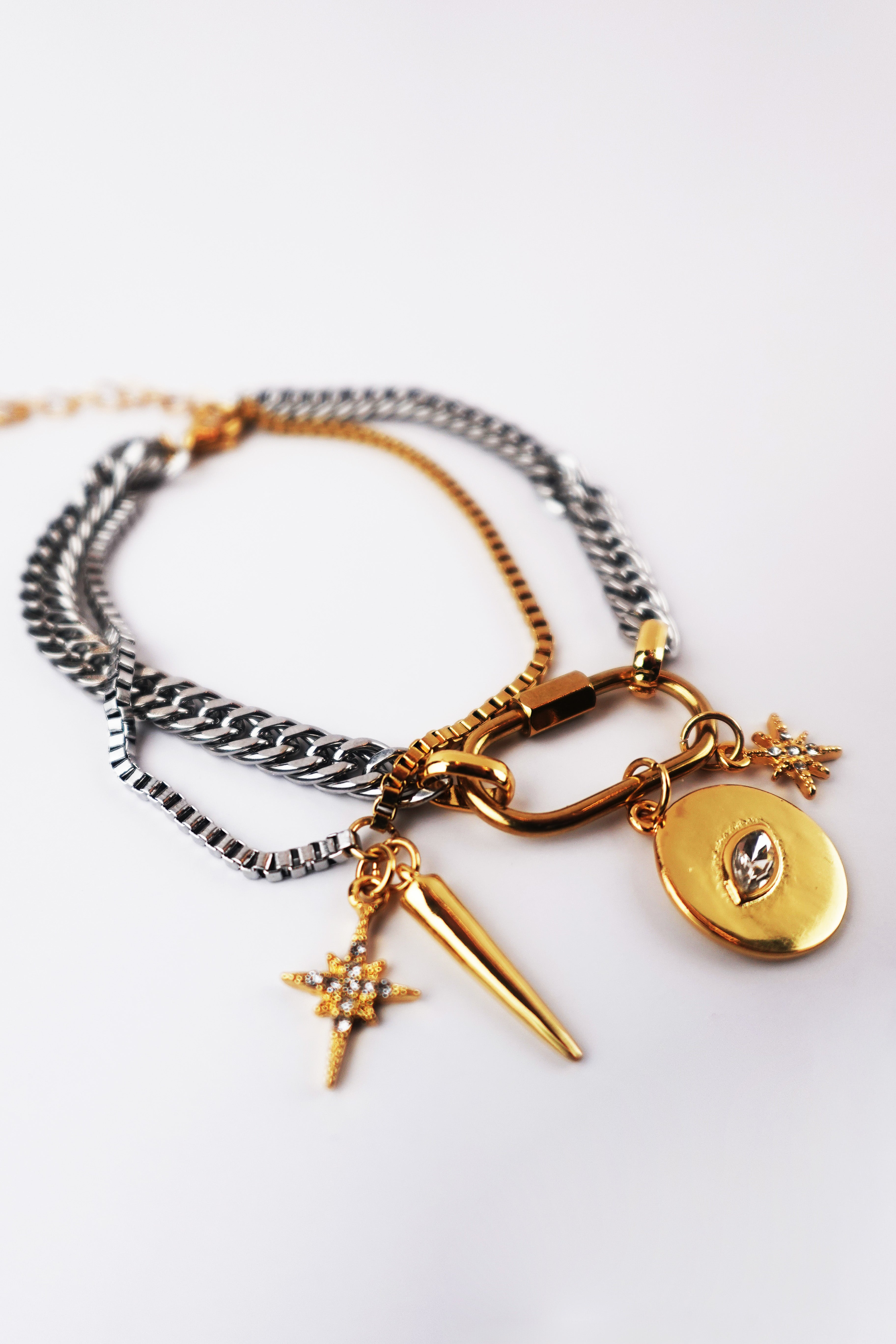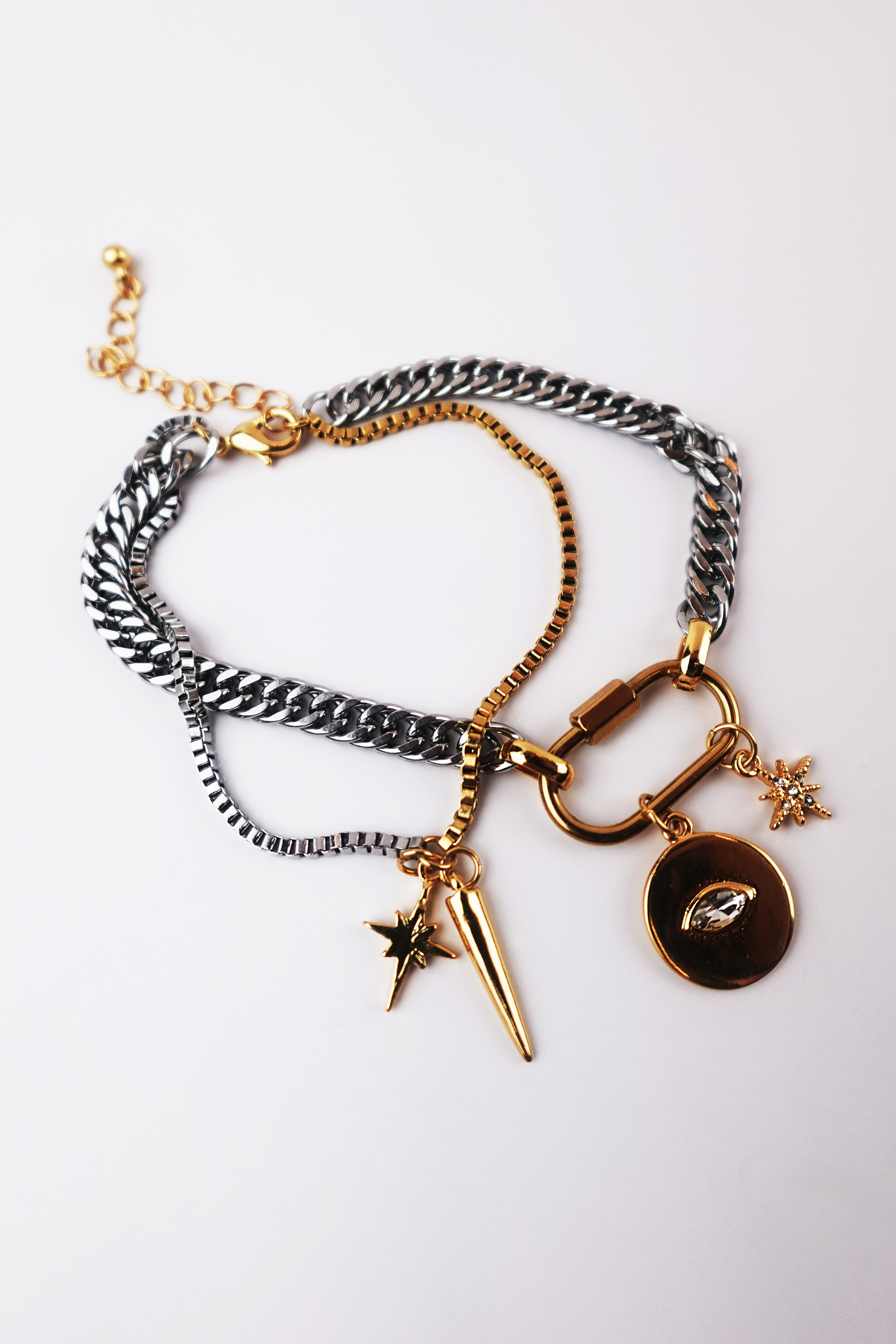The Mystic Protection bracelet is a bold talisman piece crafted in stainless steel with 14K gold plating. Featuring a carabiner lock adorned with pavé CZ stones, it serves as a modern charm holder full of meaning and versatility.