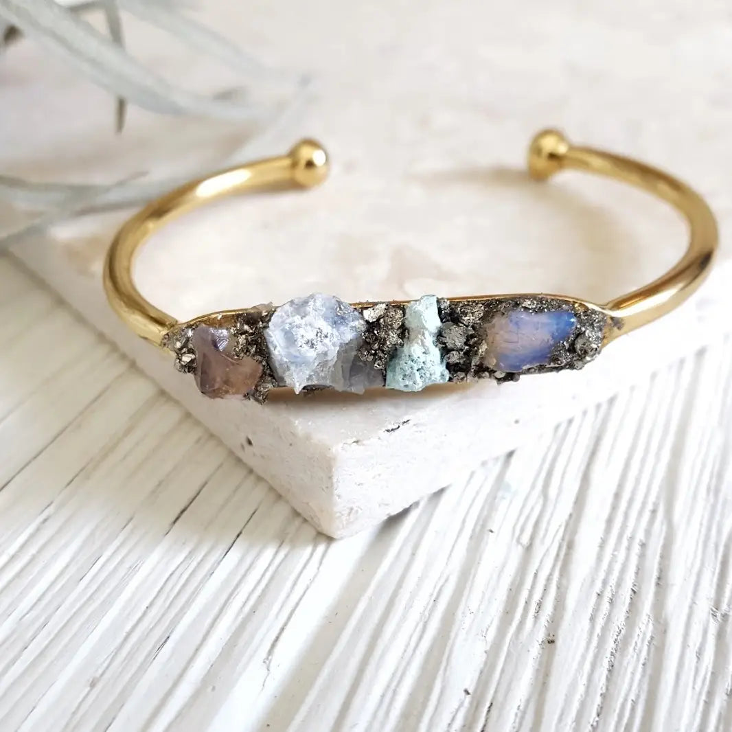A nature-inspired statement piece, this raw stone boho cuff brings together four complementary gemstones — turquoise, moonstone, amethyst, and blue calcite — accented with hand-applied pyrite for a shimmering mineral finish. The contrast between the raw textures and the smooth 18k gold-plated brass creates a modern, organic aesthetic full of character.