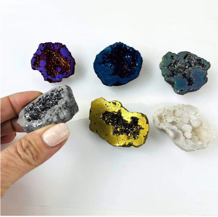 Each titanium aura quartz geode is a natural masterpiece enhanced with a metallic coating that creates a mesmerizing iridescent glow. Available in stunning colors such as Rainbow, Mystic Blue, Teal, Platinum, Gold, and Angel Aura, these vibrant pieces bring a touch of magic to any space.