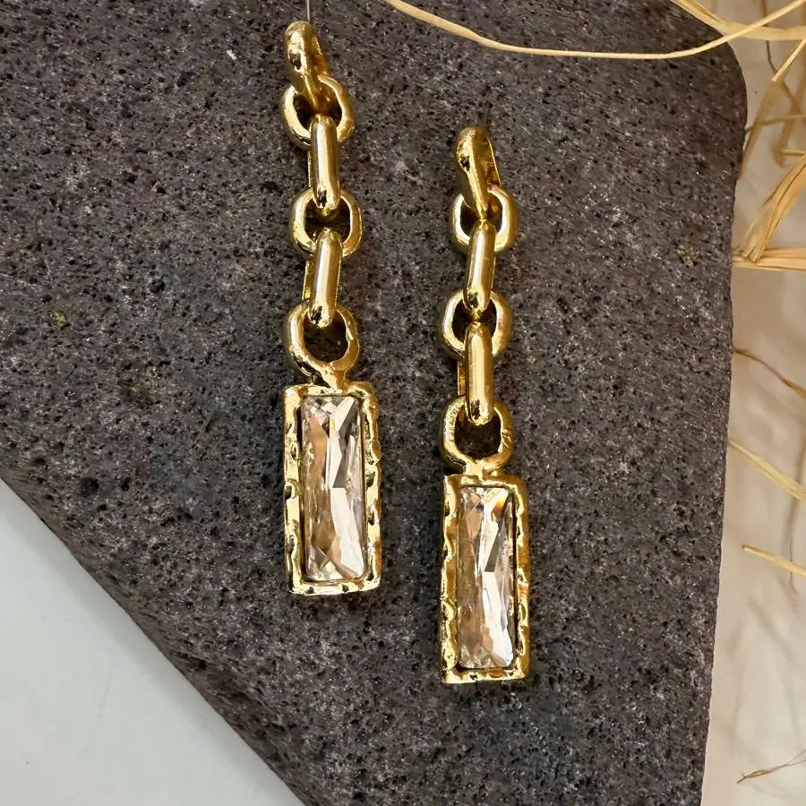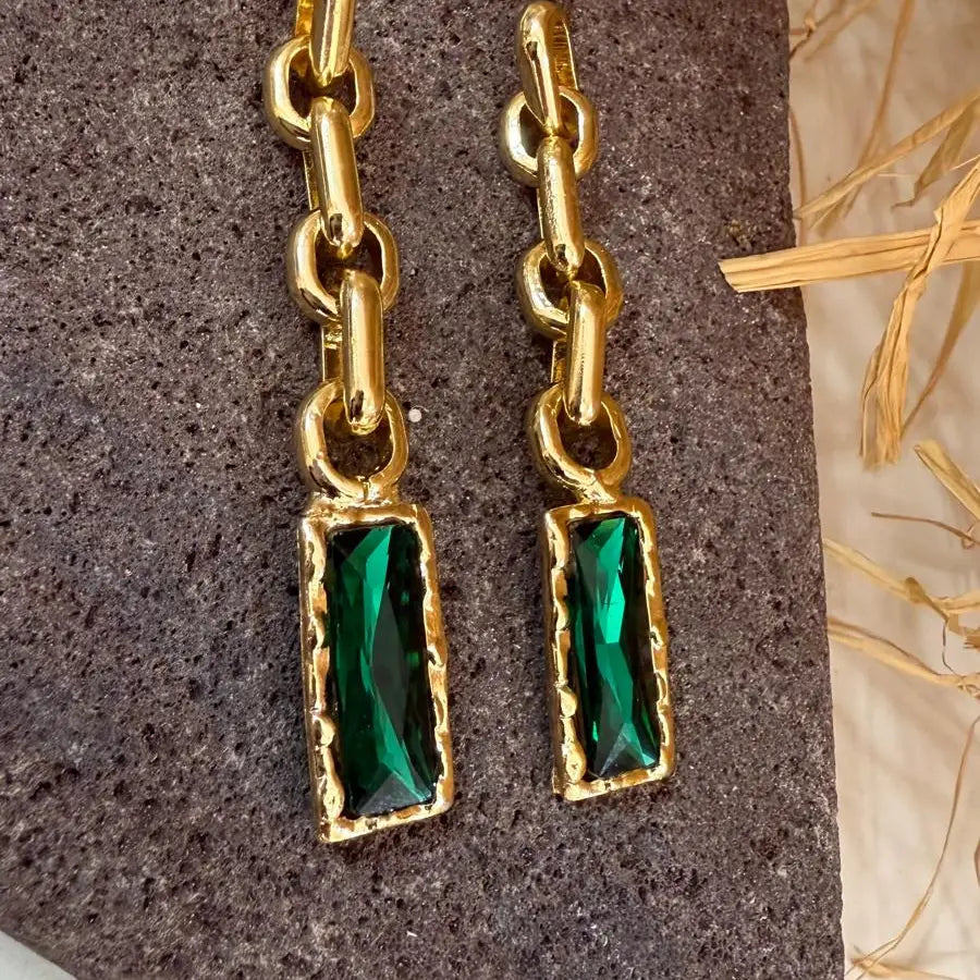 Radiant and refined, the Crystal Drop Earrings bring together modern elegance and timeless charm. Each pair features gold-plated links delicately finished with a rectangular-cut crystal that catches the light with every movement. Available in green, pink, blue, and clear, these earrings effortlessly elevate any look — from casual sophistication to evening glamour.