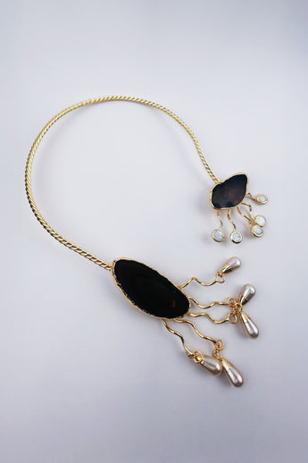 This artistic necklace combines the timeless elegance of 18K gold-plated brass with the organic beauty of natural stones and freshwater pearls. The asymmetrical design with flowing lines creates a sense of movement and refinement, making it both unique and expressive.