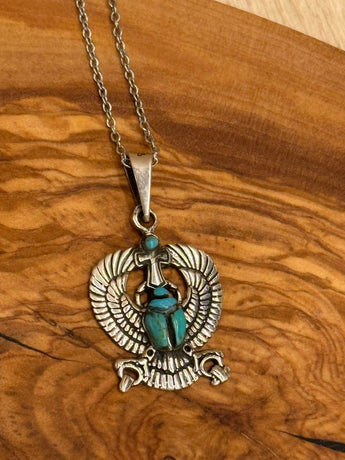 The Magical Scarab of Protection Pendant draws inspiration from the mysticism of ancient Egypt. Symbolizing life, strength, and renewal, the scarab’s outstretched wings embody divine protection, while the turquoise quartz at its center is associated with good fortune and energetic shielding.