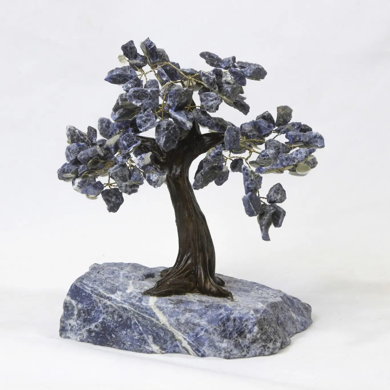 Inspired by the elegance of bonsai design, this handcrafted gemstone tree is adorned with approximately 105 natural sodalite stones on a matching sodalite base. Each piece is unique, reflecting the beauty and individuality of natural stone.