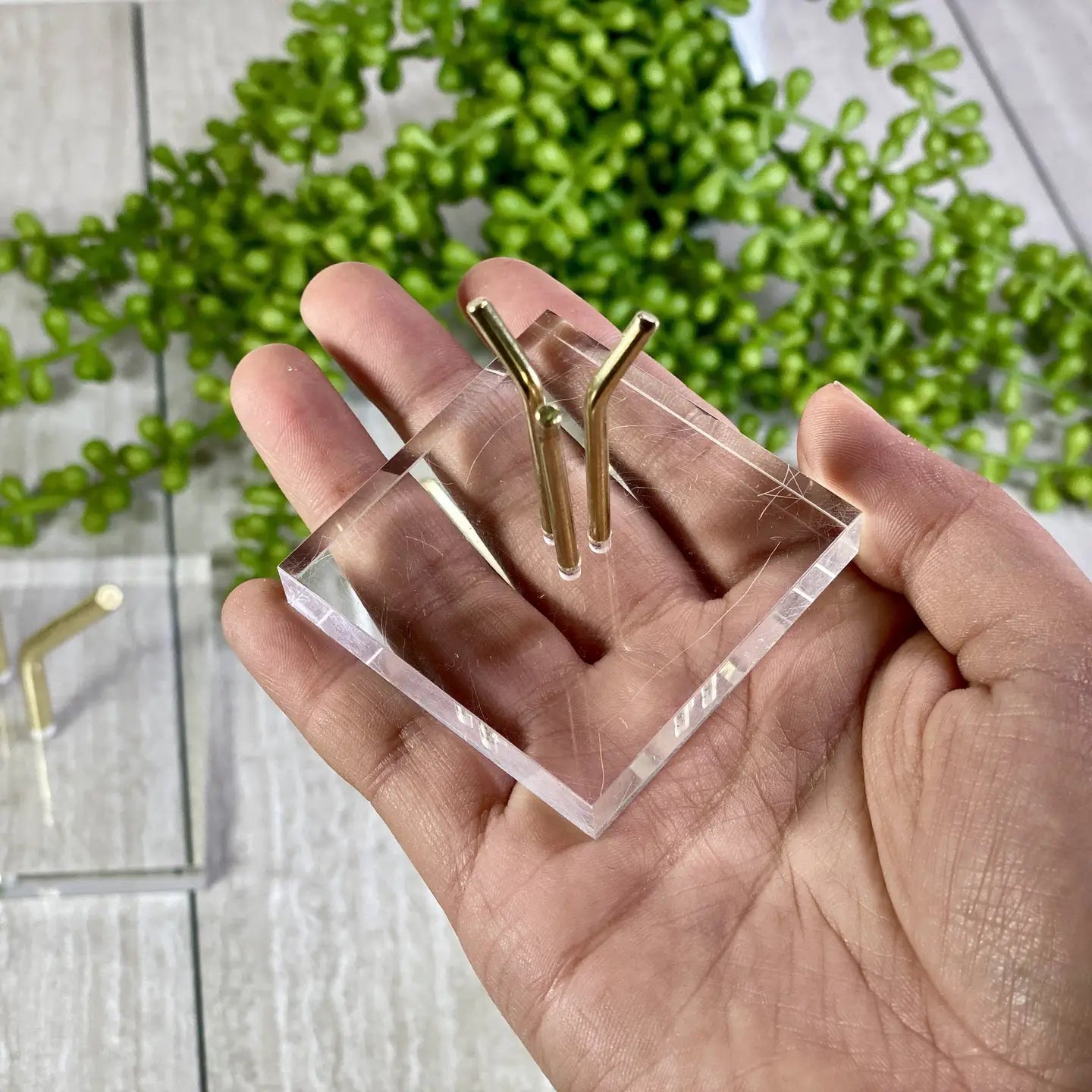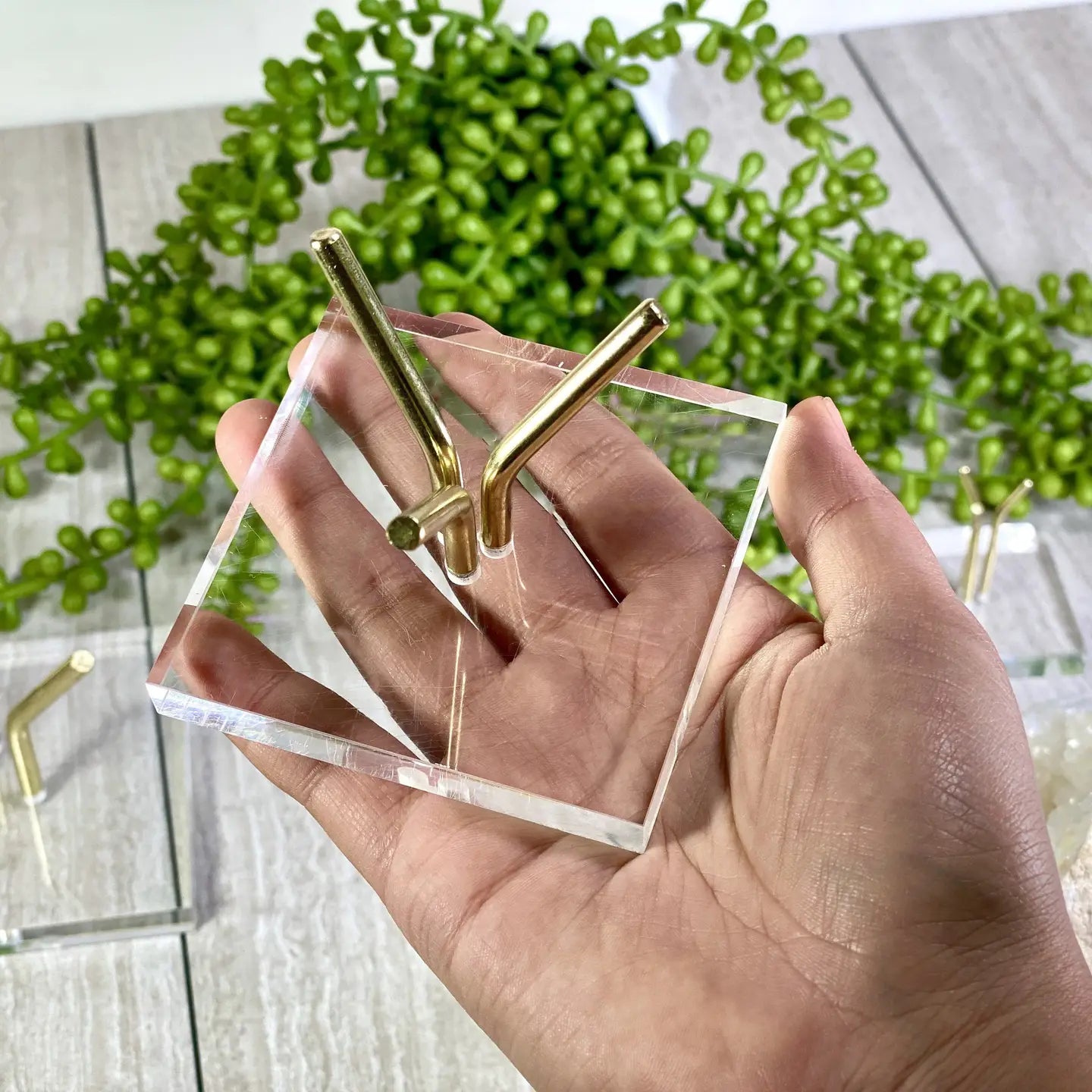 Featuring a clear acrylic base with gold-tone metal posts, this stand offers a refined and modern way to display spheres, clusters, or special pieces from your crystal collection. The transparent base keeps the focus on the crystal while the gold accents add a subtle touch of sophistication.