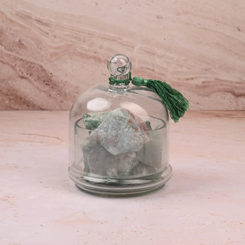 This Green Aventurine crystal aroma diffuser blends refined design with sensory wellness, creating a decorative piece that enhances both atmosphere and aesthetics. Encased in a clear glass dome, the natural aventurine stones add texture, depth, and a calming visual presence.