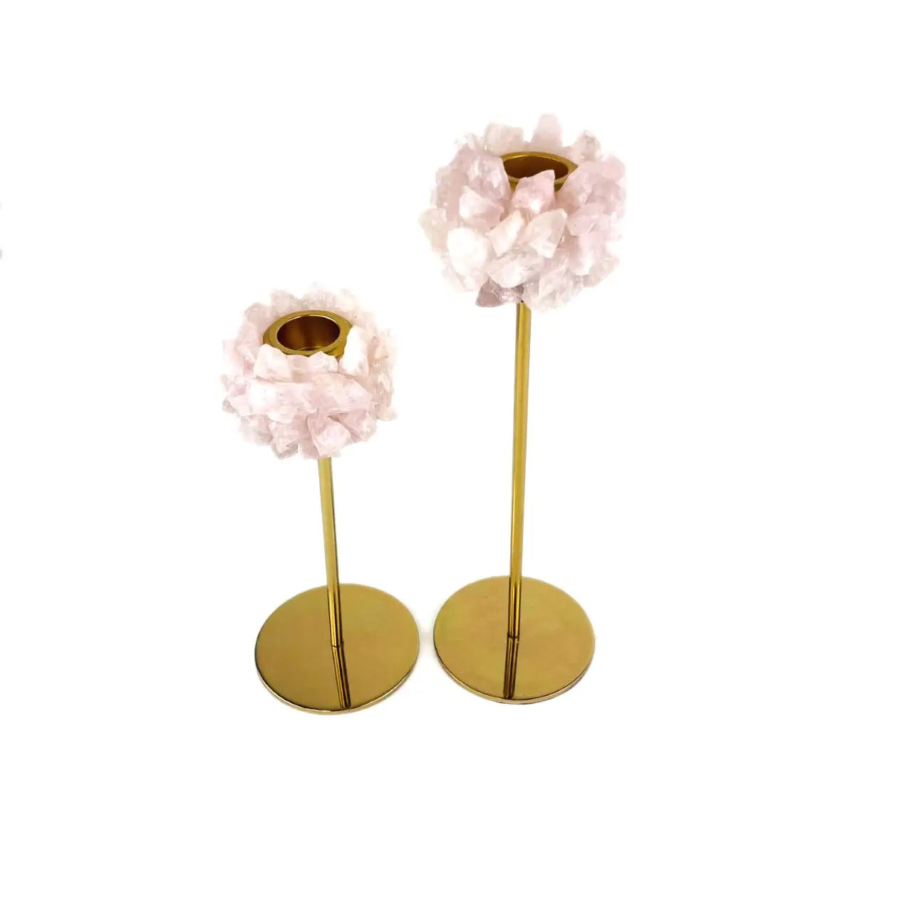 Add an elegant, luminous touch to your space with this stunning rose quartz taper candle holder, set on a refined gold pedestal. Crafted from natural crystal clusters, each piece features unique variations, making it a sophisticated accent for dining tables, sacred spaces, or home décor displays.
