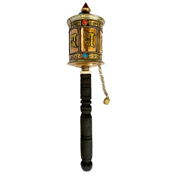 This beautiful Tibetan Prayer Wheel is handcrafted in Nepal using brass, copper, and a wooden handle, combining traditional craftsmanship with deep spiritual symbolism. The outer cylinder is engraved with the sacred mantra “Om Mani Padme Hum,” one of the most powerful and widely recited mantras in Tibetan Buddhism.