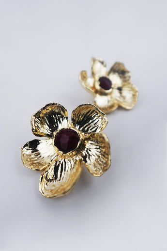 The gold-plated red agate flower earrings stand out for their delicate and feminine design that blends the strength of natural stone with the elegance of gold. Each metallic petal highlights the deep red tone of the central gemstone, creating a sophisticated and striking contrast.