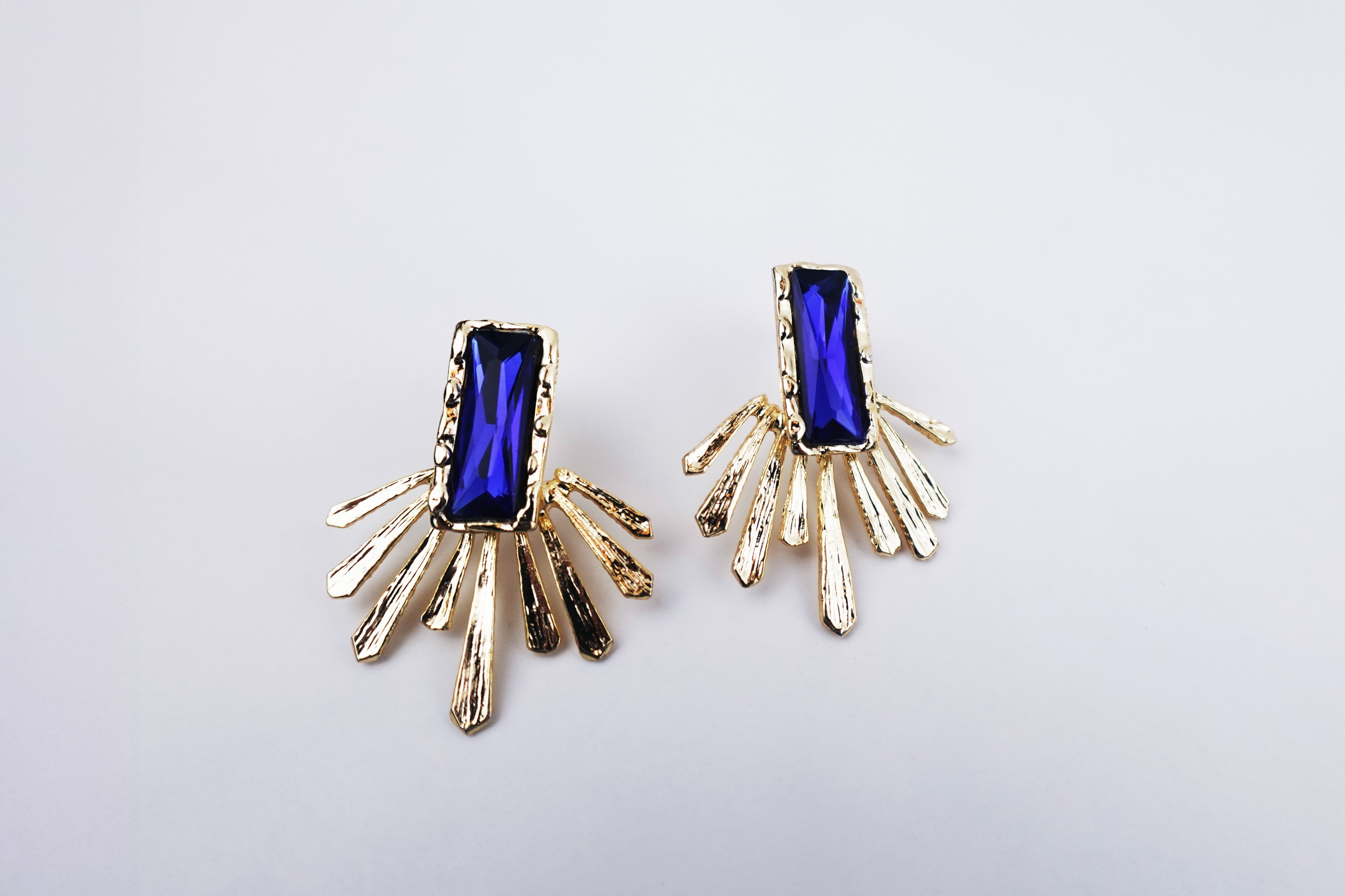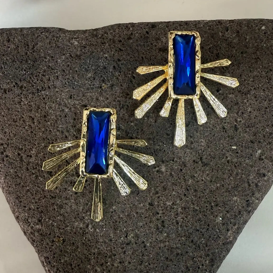 The Blue Crystal Earrings blend craftsmanship and sophistication in a radiant design inspired by sunburst rays. Each piece features a rectangular deep-blue crystal, framed with textured gold-plated details that evoke energy and elegance.