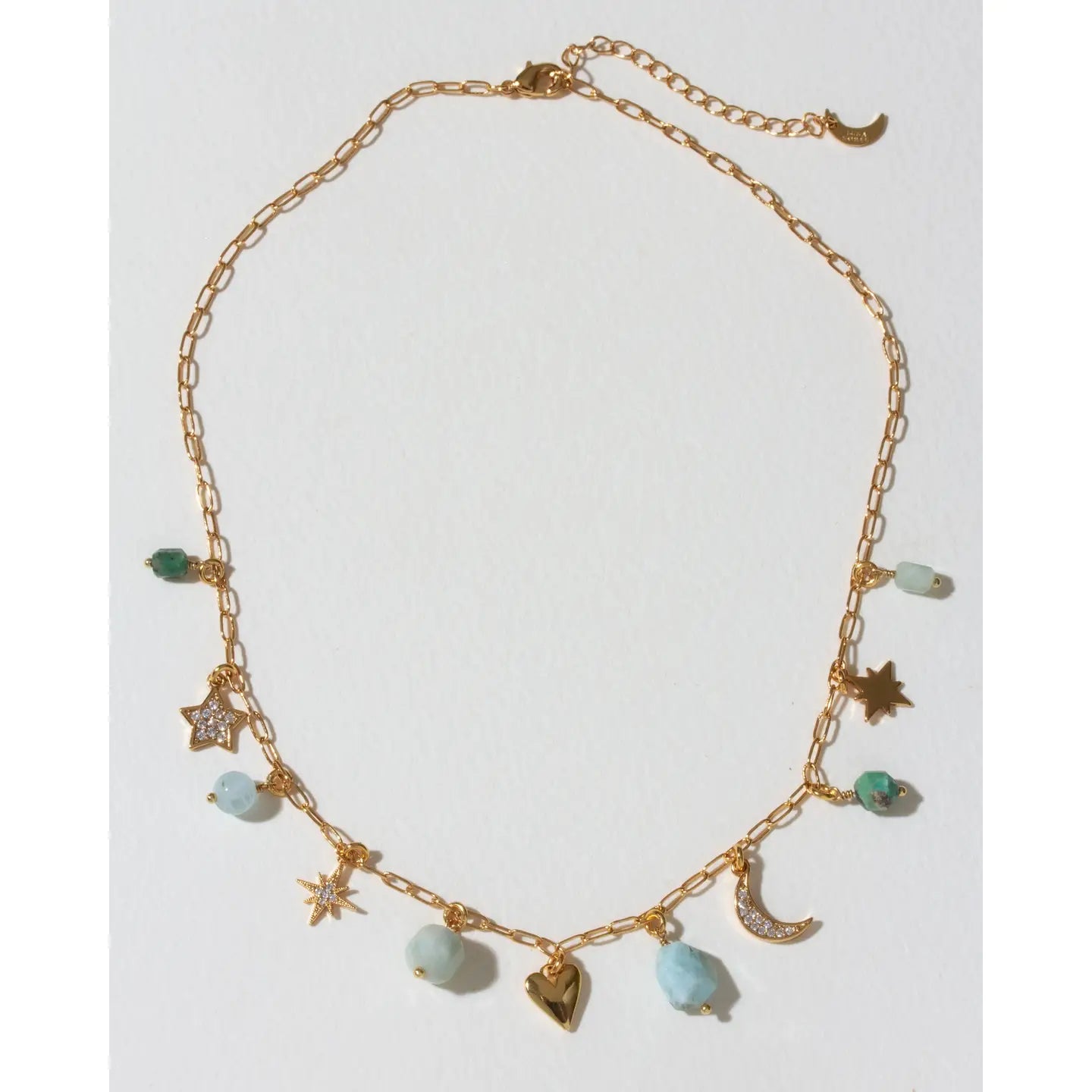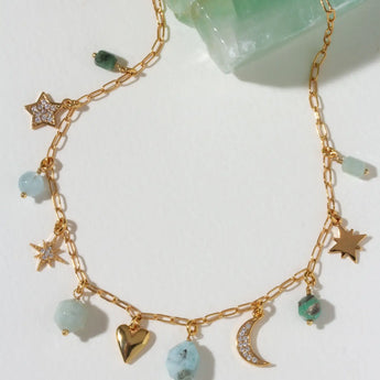 Inspired by the calm beauty of clear skies, the Blue Skies Necklace combines delicate celestial charms with a serene mix of emerald, aquamarine, new jade, larimar, and chrysocolla. Each gemstone radiates soothing shades of blue and green, reflecting balance, peace, and renewal.