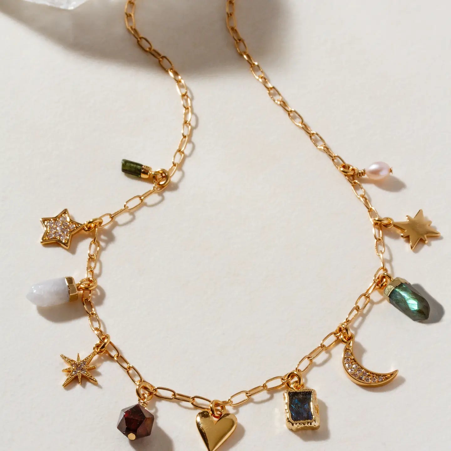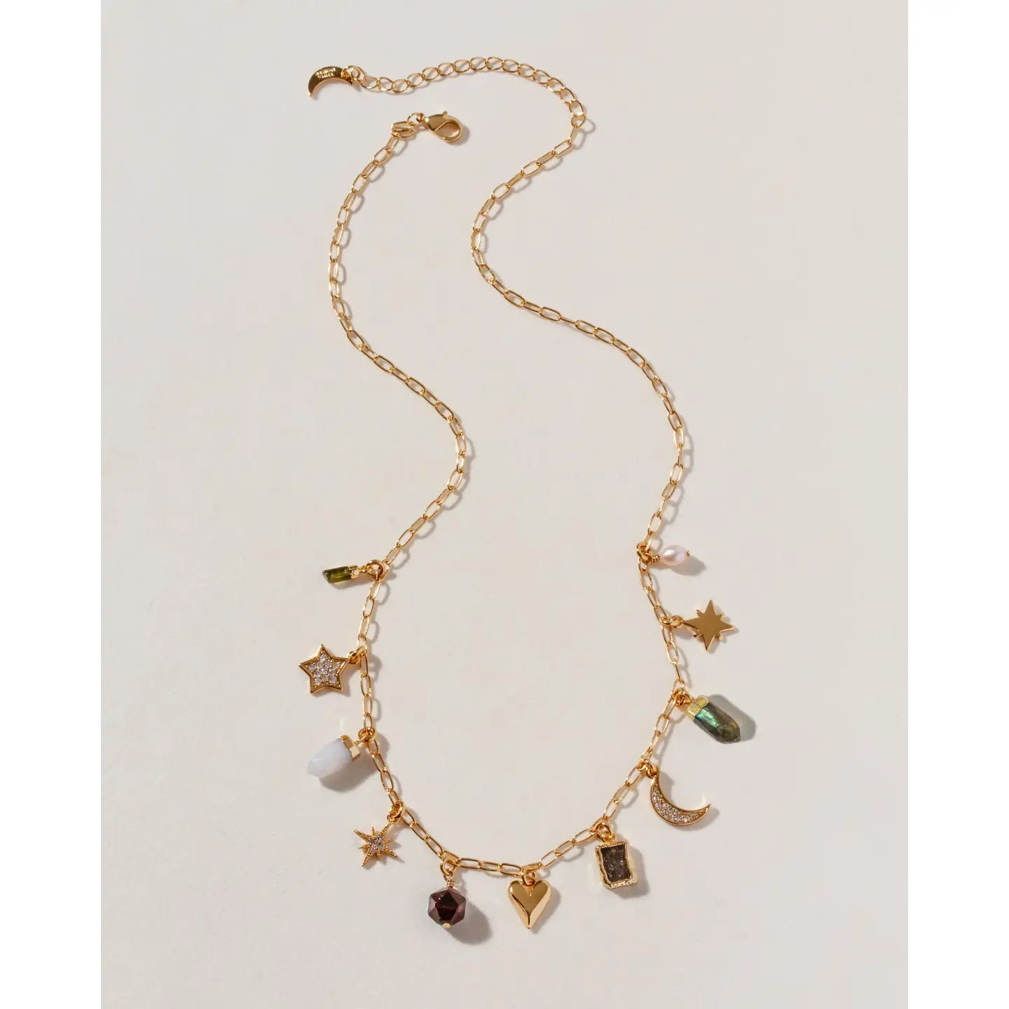 Crafted in 14KT gold-plated brass, this necklace features symbolic charms — stars, hearts, and a crescent moon — that evoke harmony and light. Lightweight and versatile, it can be layered with other pieces or worn alone for a refined statement of effortless elegance.