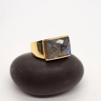 A statement of strength and mystery, the Labradorite Brass Cocktail Ring captures the captivating iridescence of labradorite — a stone known for transformation, intuition, and protection. Its faceted rectangular cut enhances the natural play of light, while the bold brass band brings a refined, modern balance.