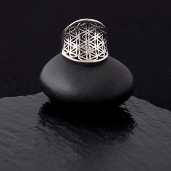 Inspired by the harmony of sacred geometry, this Sterling Silver Seed of Life Ring embodies balance, creation, and interconnectedness. Handcrafted with a delicately curved shape, it follows the natural contour of the finger for both comfort and elegance.