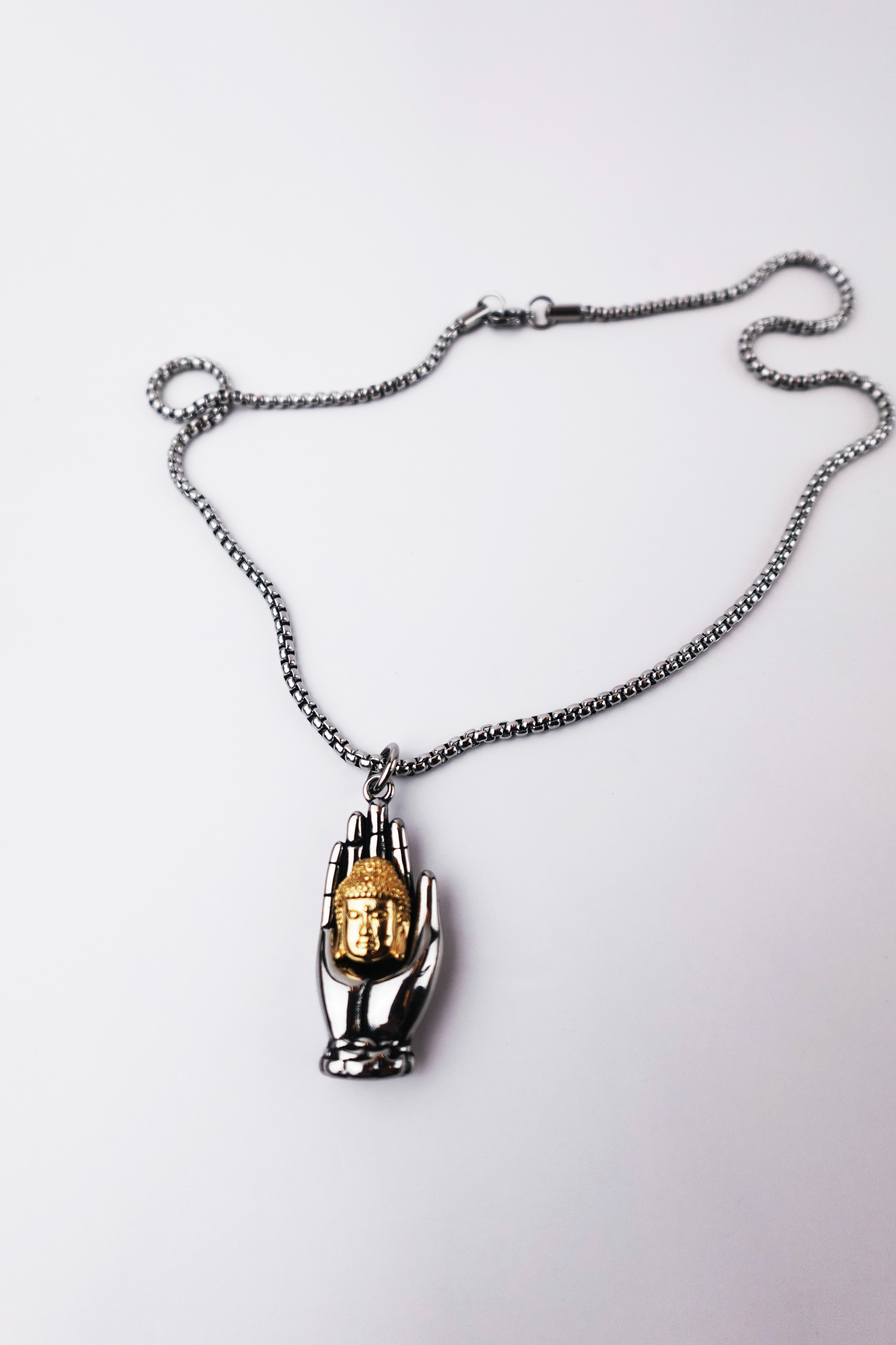 The Buddha Palm Necklace is a symbolic talisman crafted in waterproof 316L stainless steel. It features a silver palm holding a golden Buddha head, representing inner peace, awareness, and spiritual protection.