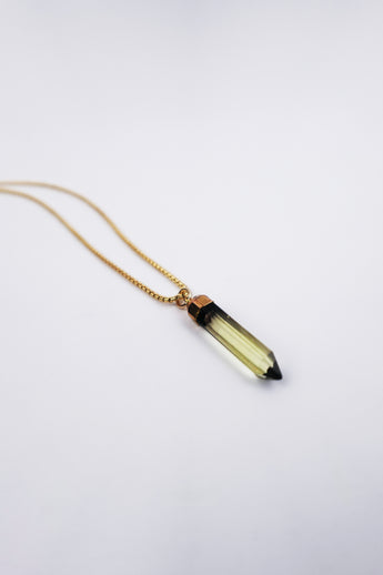 A radiant necklace featuring a natural quartz point (approx. 35 mm) with golden lemon quartz and smoky tones. Suspended from a 2 mm 14K gold-filled chain, this piece blends elegance with energetic purpose.