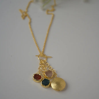 This Apatite, Carnelian & Moonstone pendant necklace is a handcrafted piece that blends organic elegance with contemporary design. The brass chain with a warm golden finish features a cluster of natural gemstone pendants, adding texture, color, and subtle movement to any outfit.
