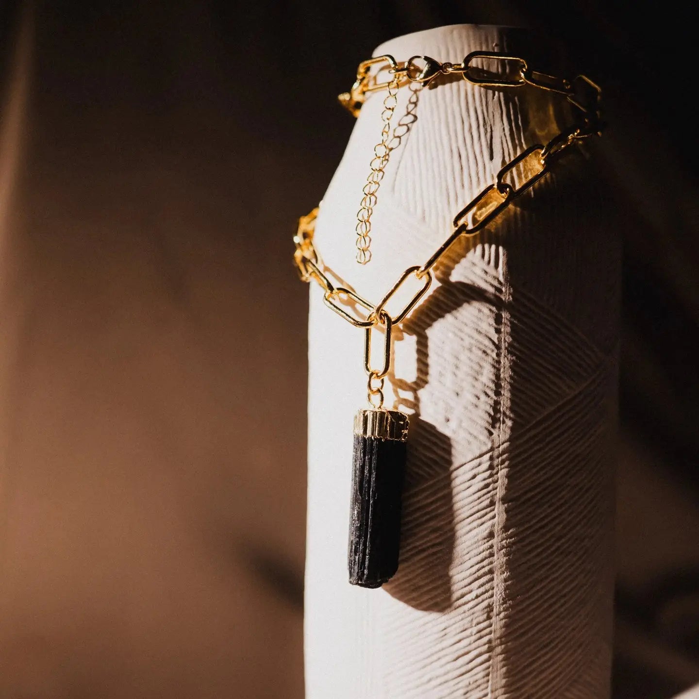A bold symbol of strength and protection — this necklace features a black tourmaline pendant on an 18k gold-finished link chain. The raw cut of the stone enhances its natural energy, while the geometric pendant design adds a refined, modern touch.