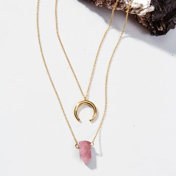The Gemstone Point Necklace Set – Rose Quartz combines modern elegance with the timeless charm of natural stones. This two-layer design features 14K gold-plated chains: