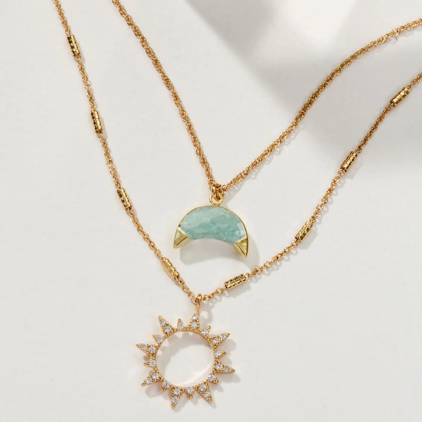 The Live By the Sun, Love By the Moon Necklace Set celebrates balance and duality with a radiant celestial design. Crafted in 14K gold-plated brass, this two-layer necklace features a sparkling sun pendant adorned with cubic zirconia and a crescent moon with genuine aquamarine — a gemstone valued for its calming and clarifying energy.