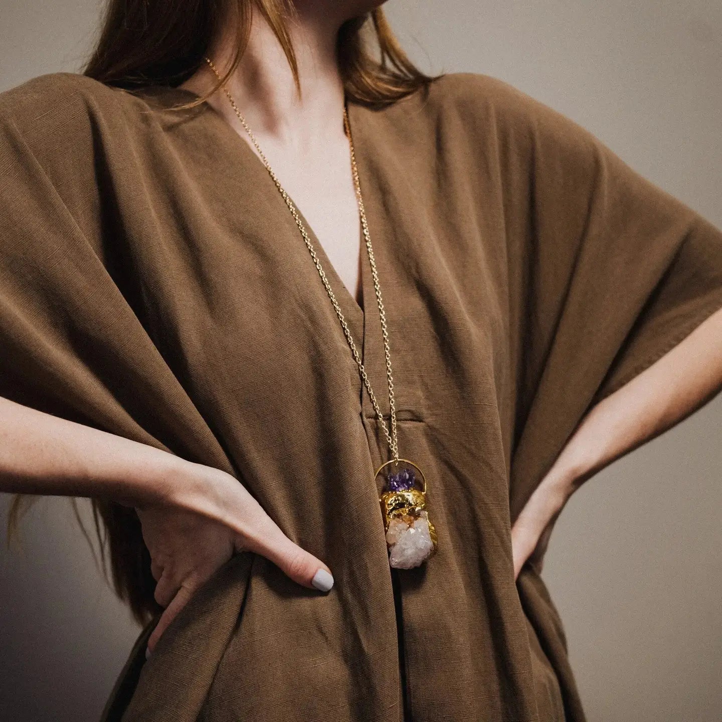 Connect with your inner essence through this striking long necklace crafted with raw amethyst — a stone known for its calming, protective, and spiritual energy. Each piece is one-of-a-kind, blending organic textures with a refined gold finish to create a jewel that celebrates natural imperfection and beauty.
