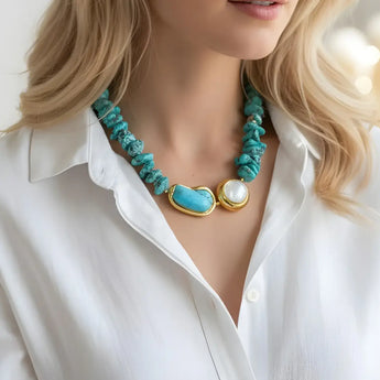 A statement of elegance and authenticity — this limited-edition necklace fuses the vibrant energy of natural turquoise with the timeless grace of pearls. Each stone is framed in polished gold-tone settings, creating a harmonious balance between organic texture and refined design.