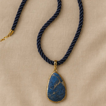 Where elegance meets intention — this necklace blends the strength of a navy braided cord with the natural beauty of a teardrop turquoise stone framed in gold. Known as a symbol of protection and balance, turquoise brings a serene yet powerful energy to your look. Versatile and timeless, it’s the perfect accessory for those who value style with meaning.
