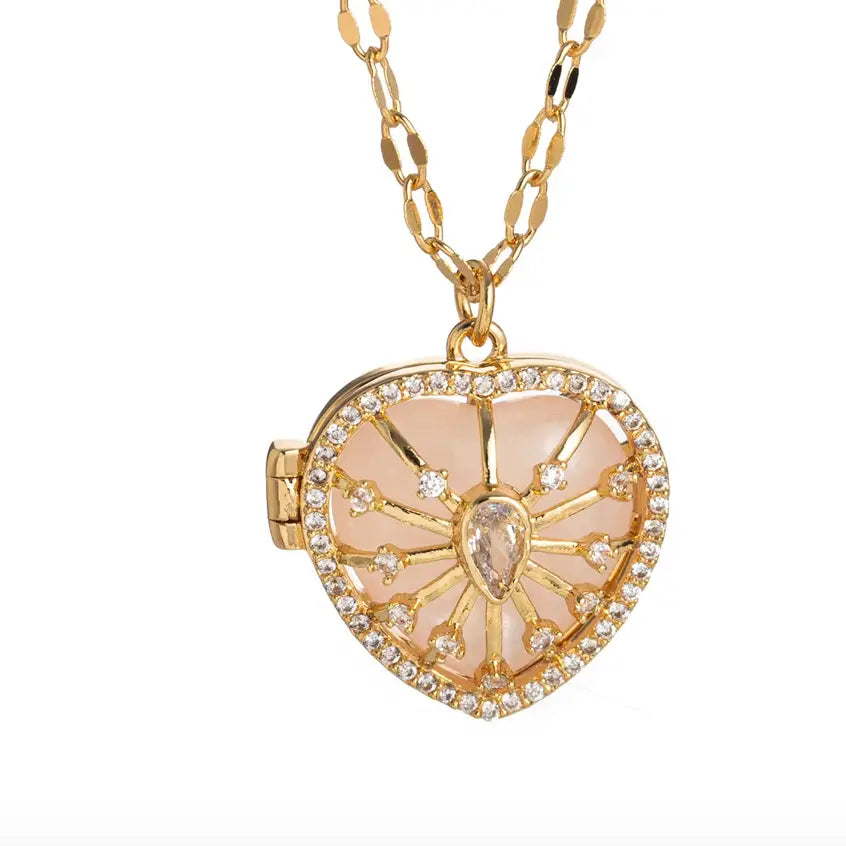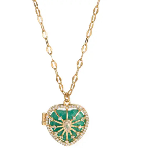 The Open Your Heart Gemstone Locket Necklace is a beautifully crafted heart-shaped pendant designed to hold a natural gemstone within an intricate cage setting. The delicate structure opens like a locket, allowing the gemstone inside to be revealed and admired.