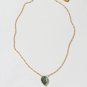 The Secret Garden Necklace features a beautifully hand-carved labradorite leaf pendant, designed to capture the stone’s natural iridescence and organic texture. Suspended from a refined 14KT gold plated brass chain, this botanical-inspired piece brings effortless sophistication to any look.