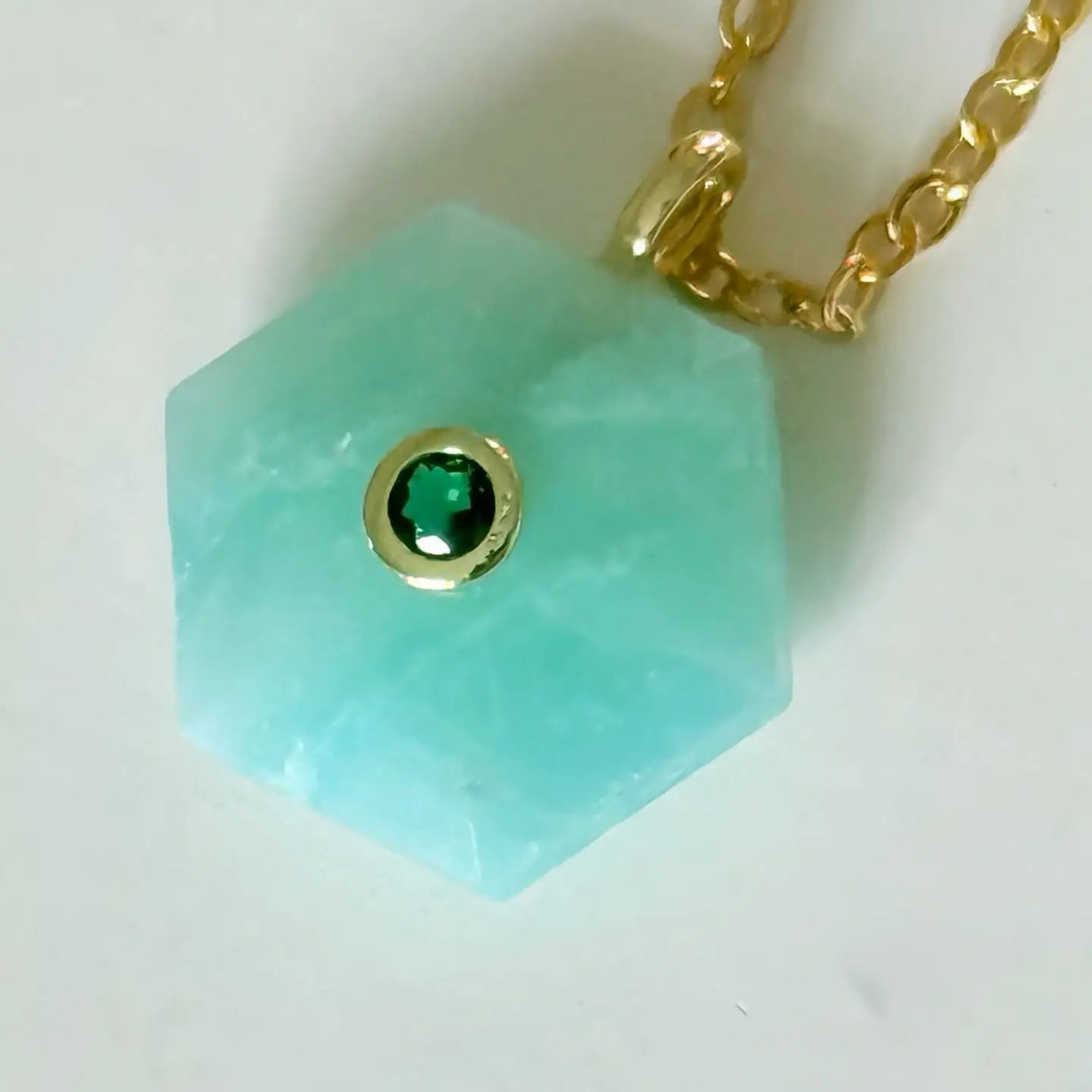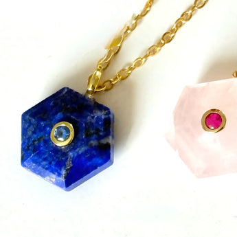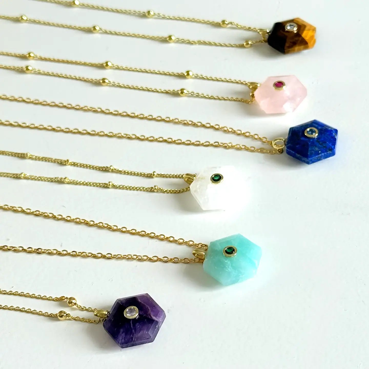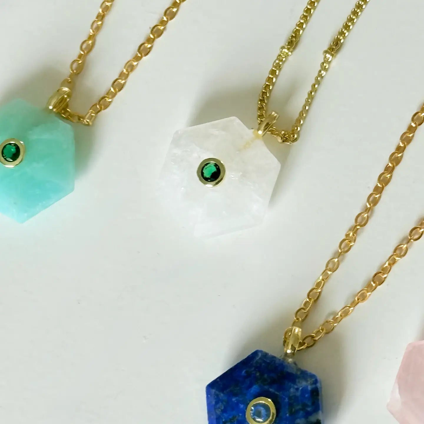 The Stillness Octagon Gemstone Necklace features a beautifully hand-cut octagon gemstone pendant accented with a delicate CZ “eye” stone at its center. Inspired by the symbolism of the octagon, this design represents balance, renewal, and the harmony of energies working together.