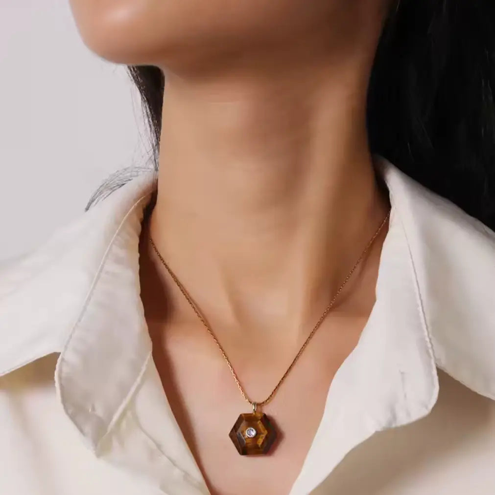 Suspended from a 14K gold PVD stainless steel chain, this necklace blends modern elegance with meaningful symbolism. Its geometric form and vibrant natural stones make it a refined piece for everyday wear.