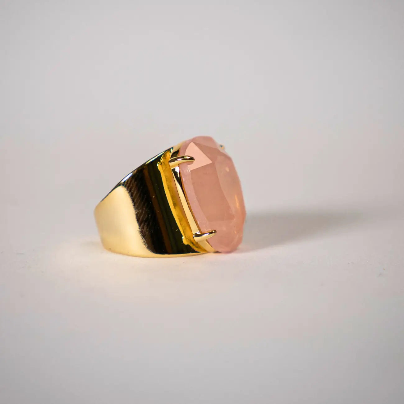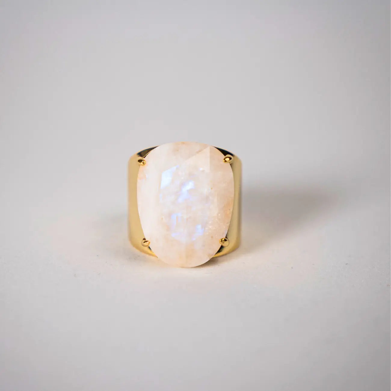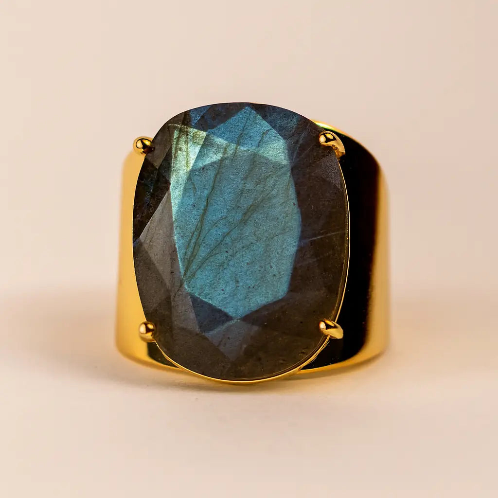 A timeless statement piece handcrafted to highlight the raw beauty of nature. This adjustable ring features an oval-cut natural gemstone with a faceted finish, set on a sleek 18K gold-plated bronze band.