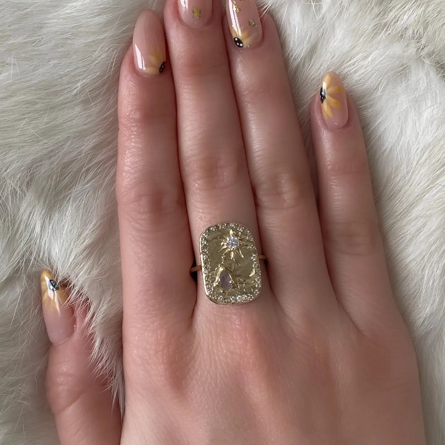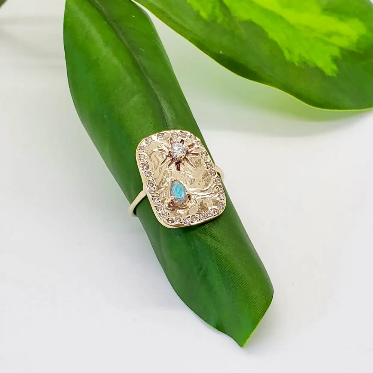 Inspired by the magic of the night sky, this brass statement ring features a labradorite gemstone framed by a crystallized moon and star motif. The soft iridescence of labradorite mirrors the shifting light of the cosmos, symbolizing intuition, protection, and spiritual awakening.