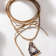 The Hold 'Em Bow Tie Wrap Necklace blends natural elegance with a touch of bohemian spirit. Featuring a hand-selected geode slice edged in gold, this versatile piece ties effortlessly around the neck with a soft suede cord in a neutral tone, offering endless styling possibilities.