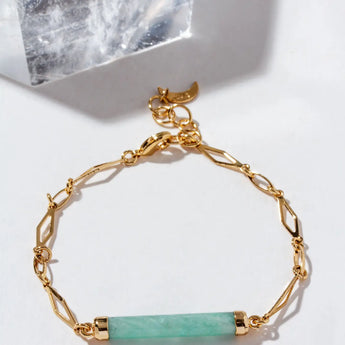 The Linear Gem ID Bracelet redefines a timeless classic with a modern twist. A smooth genuine Amazonite bar rests elegantly on a delicate geometric gold-plated chain, blending structure and serenity in perfect balance.