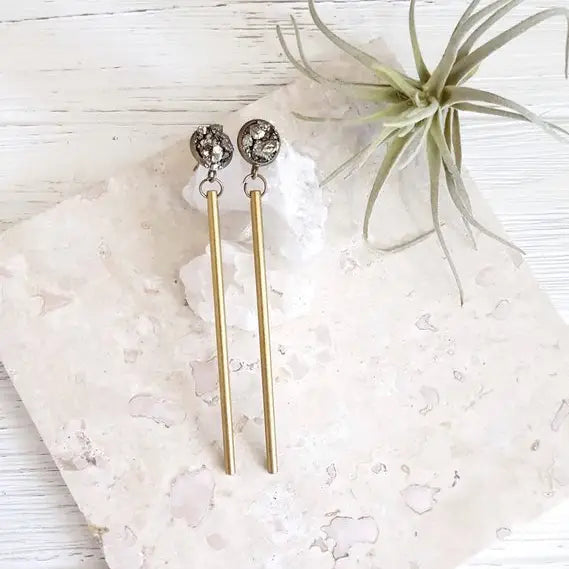 Minimalist lines meet cosmic shimmer in these raw pyrite dangle earrings. Each pair features a hand-crushed pyrite “fool’s gold” stud with a sleek golden bar drop, creating a long, elegant silhouette that moves delicately with every step.