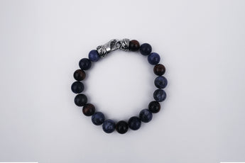 This men’s bracelet blends the deep blue of sodalite with the fiery tones of red tiger eye in 10 mm natural gemstone beads. Sodalite is known for enhancing intuition and mental clarity, while red tiger eye symbolizes vitality, grounding, and inner strength.
