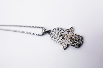 The Men’s Hamsa Pendant Necklace combines modern design with the protective symbolism of the Hamsa hand. Crafted from high-quality stainless steel, the pendant measures 2" x 1.15" and comes with a 24" box chain. A versatile piece that blends timeless style with spiritual meaning, perfect for daily wear or as a meaningful gift.