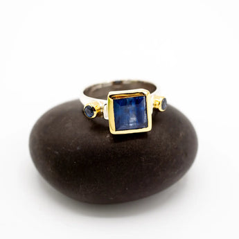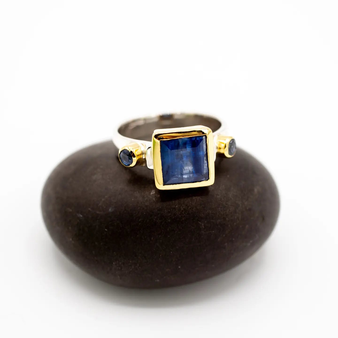 Timeless elegance meets artisan craftsmanship in the Sterling Silver Kyanite Square Ring. Handcrafted in India, this piece features a striking faceted square Kyanite gemstone framed in warm brass, complemented by two delicate side stones.